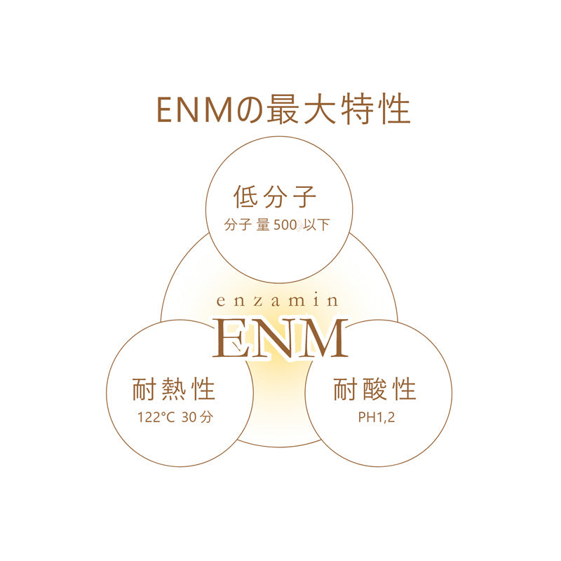 ENMは、低下した酵素の働きを活性化させ、バランスを調節する働きが試験データにより証明されています。酵素の弱点だった「 熱に弱い・酸に弱い・分子量 が大きい」という部分をクリアし、身体に吸収しやすく働きやすい状態になっています。